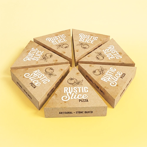 Die-cut boxes are made in unique shapes and cutouts that are perfect for showing on social media. It improves the customer's pizza slice unboxing experience. These are great for branding. It also acts as a marketing tool for your brand.
