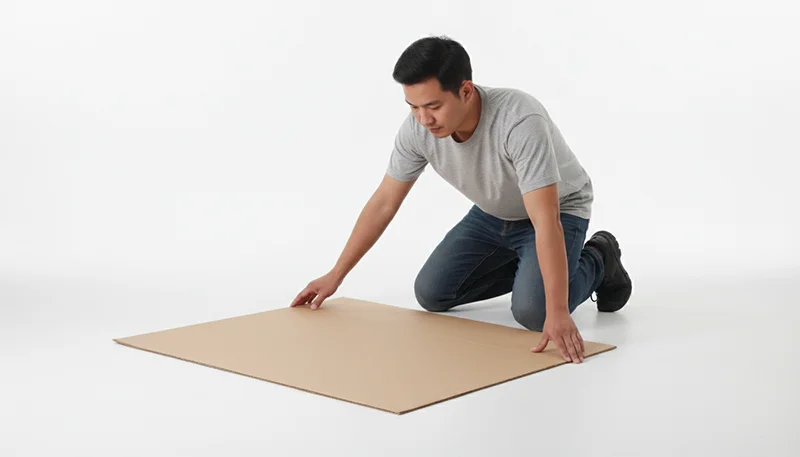 In order to keep the place tidy and also the box clean. Place a plain rug and mat on the floor. After that, put the cardboard sheets you bought from the store onto it.