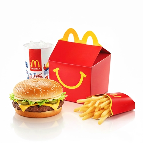 The happy meal box mostly contains a kids' meal, such as sandwiches, nuggets, burgers, fries, drinks, and apple slices. In addition to making kids excited, a toy or book can also be added.